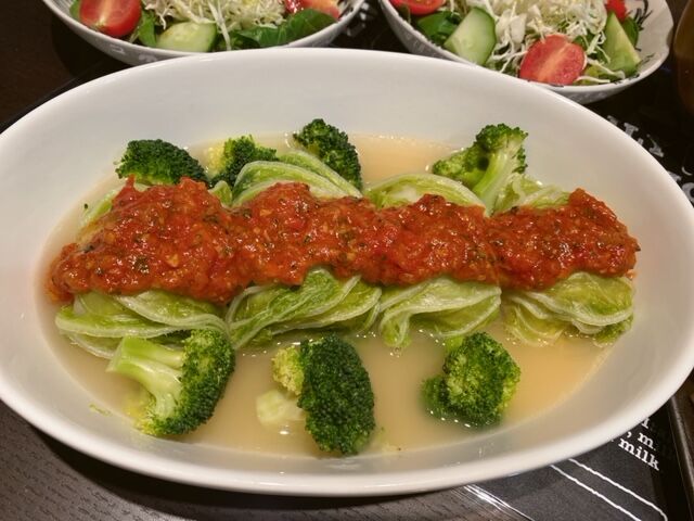 ❺ ❹に火が入ると盛り付けトマトソースをかけて出来上がり。