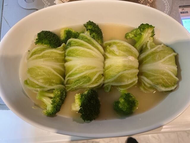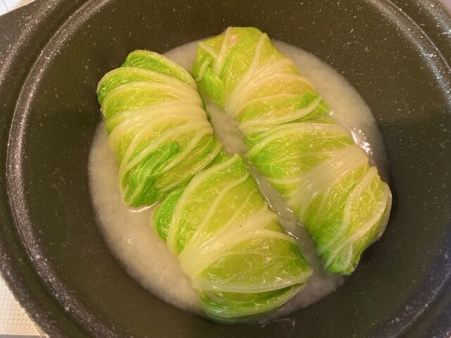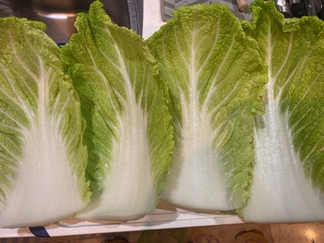 ❷鍋にお湯を沸かし塩を海の水より辛くないくらいの量を入れます。白菜を湯がいて塩水で粗熱をとりしっかり水気を切る。